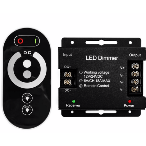 Контроллер диммер одноцветный T3 RF 30A сенсорный ПДУ - предназначен для управления свечением светодиодной ленты с помощью пульта дистанционного управления в радиодиапазоне. Рабочее напряжение - 12-24 вольта, максимальная мощность при токе 30А 720Вт при 24в или 360Вт при 12В. Расстояние до пульта не более 15 метров.