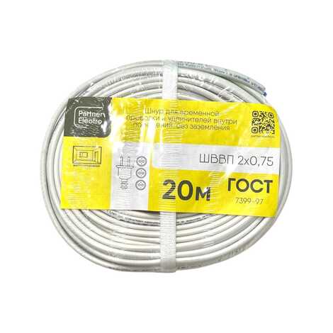 Шнур ШВВП 2х0,75 ГОСТ (20м) – шнур гибкий с параллельными медными жилами с изоляцией и оболочкой из ПВХ-пластиката на напряжение до 380 В для систем 380/380 В. Шнур ШВВП применяется для присоединения приборов личной гигиены и микроклимата, электропаяльников, светильников, кухонных электромеханических приборов, радиоэлектронной аппаратуры, стиральных машин, холодильников и других подобных приборов, эксплуатируемых в жилых и административных помещениях. Страна производства — Россия.