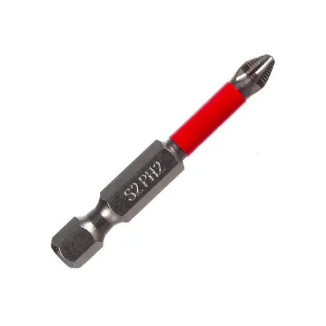 Имеет суженную шейку, которая позволяет бите немного скручиваться и пружинить обратно, устраняя пики нагрузок, за счет чего продлевается срок службы. Для удержания шурупа все биты намагничены.