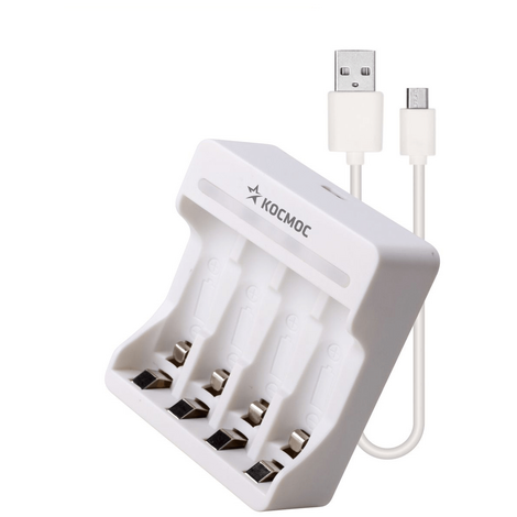Зарядное устройство «Космос» предназначено для зарядки никель-металлогидридных (Ni-MH) аккумуляторов типоразмера AA и AAA. Устройство имеет четыре независимых канала и питается от USB-порта. Максимальный ток заряда составляет 1800 мА для аккумуляторов AA и 900 мА для AAA. В комплекте идёт USB-кабель.