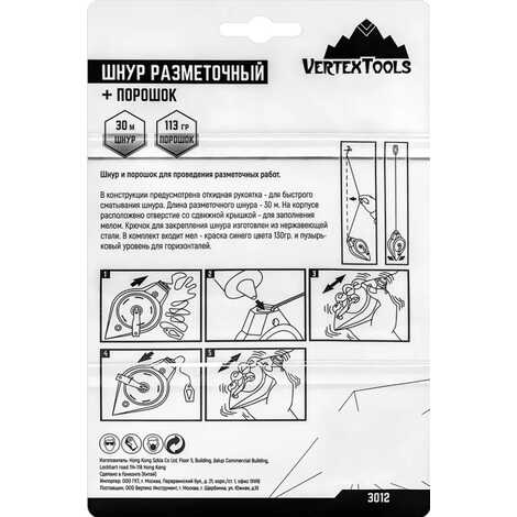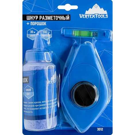 Разметочный шнур + порошок применяется при строительных и отделочных работах. Имеет длину 30 метров и позволяет производить как вертикальные, так и горизонтальные разметки. Разметочный шнур длиной 30 м. Красящий порошок в флаконе массой 130 г. Мини-уровень, крепящийся на шнуре.