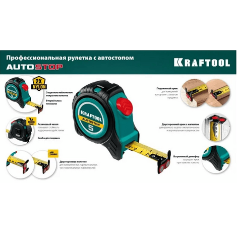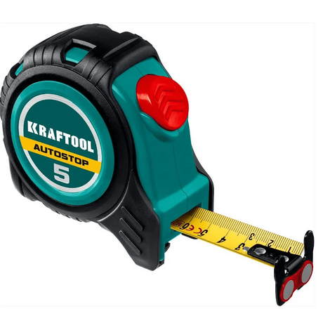 Рулетка с автостопом KRAFTOOL AutoStop длиной 5 метров и шириной полотна 25 миллиметров — это профессиональный инструмент для точных измерений. Она оснащена автоматическим фиксатором полотна, что обеспечивает удобство работы и долговечность. Нейлоновое покрытие измерительного полотна увеличивает его стойкость к истиранию. Подвижный крюк с магнитом повышает точность измерений и удобство при фиксации в упор.