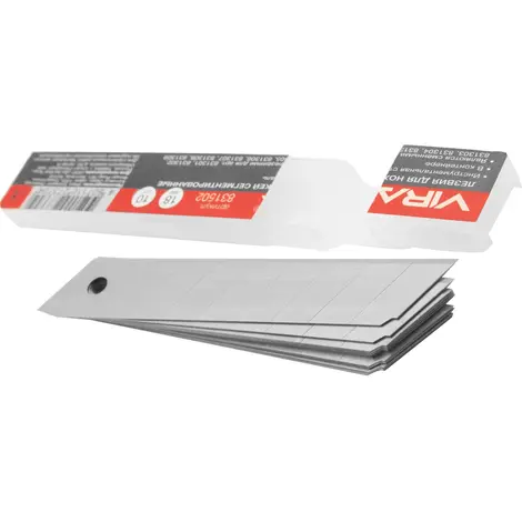 Лезвия д/ножей сегментные 18мм. Предназначены для разрезания бумаги, картона, пленки, ткани, резины. Каждое лезвие имеет засечки для надлома затупившегося сегмента. Размер: ширина - 18 мм, длина - 100 мм. Набор включает в себя 10 сегментированных лезвий для ножей. Материал: высокоуглеродистая сталь CS.