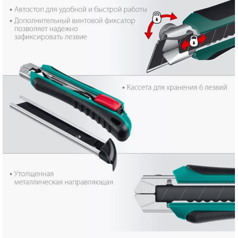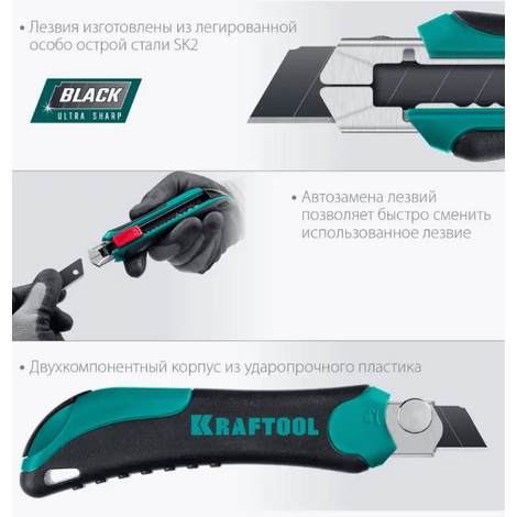Нож KRAFTOOL 18 мм — это профессиональный инструмент для разрезания различных материалов, таких как линолеум, ковровые покрытия, гипсокартон, пластик и дерево.