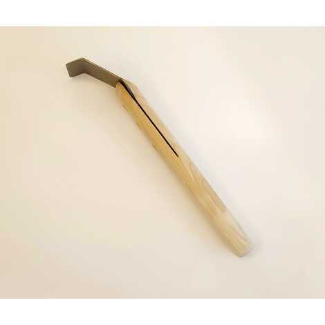 Шпатель 90 градусов два гиба длина ручки 24 см (код 02) – шпатель закарнизный имеет широкую тюльпановидную рабочую часть с двумя гибами. Изготавливается из стали 1,5 мм нетермированной. За счет двух изгибов лезвие инструмента находится под прямым углом к рукоятке. Вследствие такой конфигурации лопатку удобно использовать для заправки полотна за карнизными элементами. Этот инструмент незаменим при монтаже многоярусных потолков. Применяется для заправки плёнки в ступенчатые багеты или гипсокартонные короба при устройстве многоуровневых конструкций со скрытой подсветкой. Шпатель с полудлинной ручкой 24 см и двумя изгибами используется для парящих потолков, когда зазор между стеной и профилем очень маленький. Вес шпателя 190 граммов.