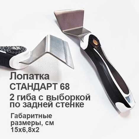 Подходит для всех типов профилей с гарпунной системой крепления. Лопатка имеет трапециевидную форму. Изгиб металлической части спроектирован так, чтобы удобно было заправить потолок не повредив обои и потолок. Крепление деталей лопатки выполнено винтовыми соединениями. Ручка выполнена из ПВХ, для удобства хвата выполнена выборка под пальцы.