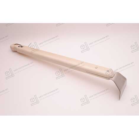 Длина ручки шпателя составляет 38 см, что обеспечивает удобный хват и контроль над инструментом во время работы. Ширина лопатки составляет 6.5 см, что позволяет быстро и эффективно обрабатывать небольшие участки профиля. Толщина металла лопатки составляет 2 мм, что придаёт ей дополнительную прочность и устойчивость к износу.