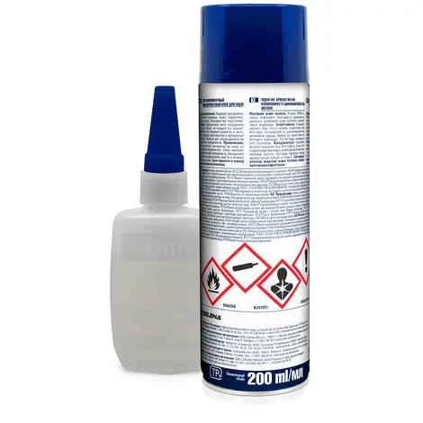 В состав материала входят спрей-активатор и цианокрилатный гель высокой вязкости. Компоненты содержатся в разных емкостях. Одна из поверхностей опрыскивается аэрозолем, другая обрабатывается гелем. Чтобы получить надежное соединение, нужно сильно прижать склеиваемые элементы и удерживать в течение нескольких секунд.