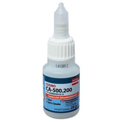 Цианоакрилатный клей Cosmofen CA 500.200 фирмы «Weiss» Это однокомпонентный быстросохнущий цианоакрилатный клей, основанный на этиле. Он характеризуется быстрым действием, приклеивание занимает всего несколько секунд. Цианоакрилатный клей Cosmofen CA 500.200 имеет многостороннее применение. Рекомендуется его применение при трудно склеиваемых предметах. Цианоакрилатный клей Cosmofen CA 500.200 наносится на одну поверхность, затем прижимается к другой до момента склеивания. Для ещё более быстрого приклеивания рекомендуется использовать активатор.