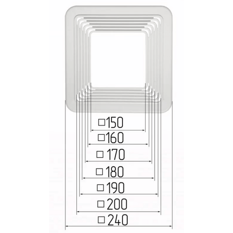 Наружный размер 240х240мм, посадочный размер 150-200мм с шагом в 10мм.