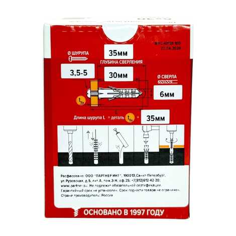 Нейлоновый дюбель Партнер PR 6x30 100 шт. предназначен для крепления легких конструкций к твердым материалам основания: бетон, натуральный камень, полнотелый кирпич. В качестве распорного элемента рекомендуется применение универсальных или сантехнических шурупов. Длина подходящего шурупа определяется как: длина дюбеля + толщина прикрепляемого материала + 5 мм. Дюбели изготавливаются из полиамида PA6 Ultramid производства компании BASF в светло-бежевом цвете.