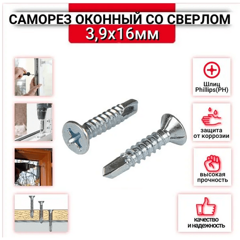 Саморез оконный сверло 3,9х16 белый цинк — это крепёжное изделие с потайной головкой, насечками для раззенковки и резьбой с мелким шагом под углом 60 градусов. Оно предназначено для быстрого и качественного монтажа армированного оконного профиля. Саморез покрыт белым цинком. В упаковке 1000 штук.