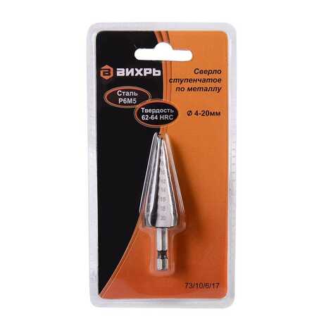 Сверло ступенчатое по металлу 4-6-8-10-12-14-16-18-20мм, P6M5, шестигранный хвост. Вихрь 73/10/6/17