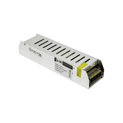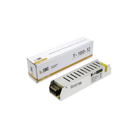 Блок питания SWG компактный (узкий), 100 W, 12V T-100-12. Габариты:190х45х33мм. Общая мощность 100Вт. Напряжение: 12V. Максимальный ток: 8.3А. Степень защиты IP: 20.