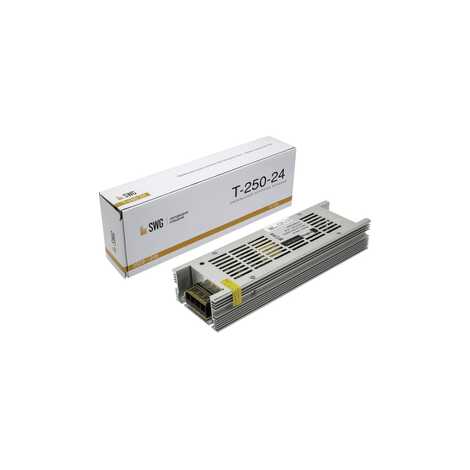 Блок питания SWG (узкий) мощностью 250 Вт и напряжением 24 В предназначен для светодиодных лент и другого оборудования, работающего от постоянного напряжения 24 В. Он имеет сверхтонкий дизайн и компактные размеры, что позволяет легко установить его в различных местах. Его артикул — T-250-24.