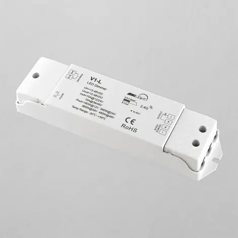 Диммер Dim LED Controller М1LIGHT V1-L, 15А — это контроллер для регулировки яркости одноцветных светодиодных лент. Он работает с постоянным напряжением 12 В или 24 В и имеет максимальную выходную мощность 180–360 Вт. Диммер использует беспроводную технологию 2,4 ГГц и может управляться пультами RS-1, RT1, RT8, R1-1, нажимным выключателем без фиксации или смартфоном через WiFi-конвертер.