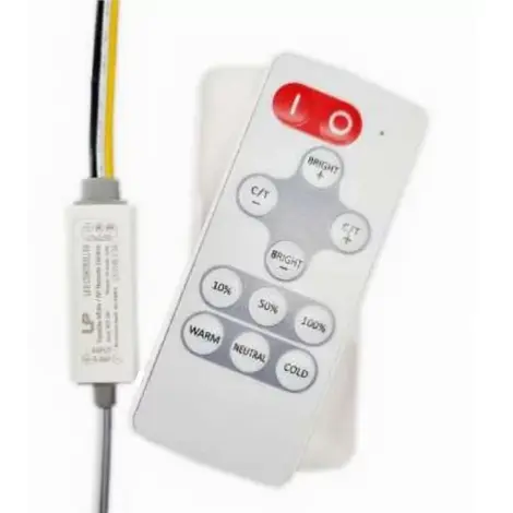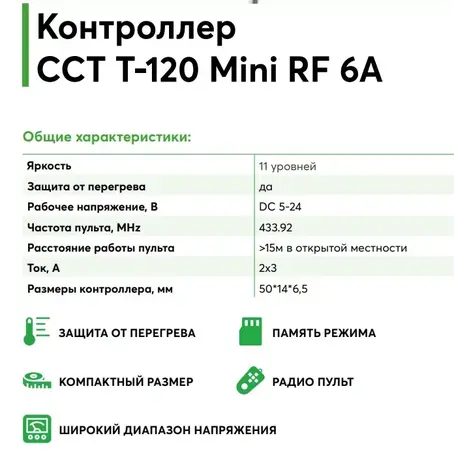 Контроллер CCT T120-S Mini 6A - предназначен для управления свечением светодиодной ленты ССТ (color changing temperature) с помощью пульта дистанционного управления С помощью пульта дистанционного управления можно переключаться между холодным и теплым белым светом. Рабочее напряжение 12-24В, ток 6 А, мощность - 72 - 144 Ватт.