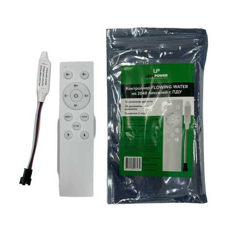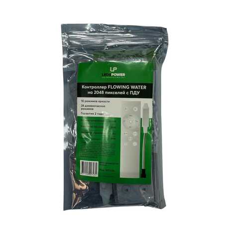 Контроллер FLOWING WATER с ПДУ способен управлять свечением светодиодной ленты с эффектом бегущей волны или текущей воды с помощью пульта дистанционного управления (например, СУЛ882 или СУЛ883). Он совместим с напряжением 12–24 вольта. Контроллер позволяет управлять до 2048 точками свечения. Расстояние, на котором он может работать, составляет до 15 метров. Доступно 10 различных режимов работы. С помощью кнопок на пульте можно регулировать яркость свечения led-ленты, скорость и выбирать разные динамические режимы работы.