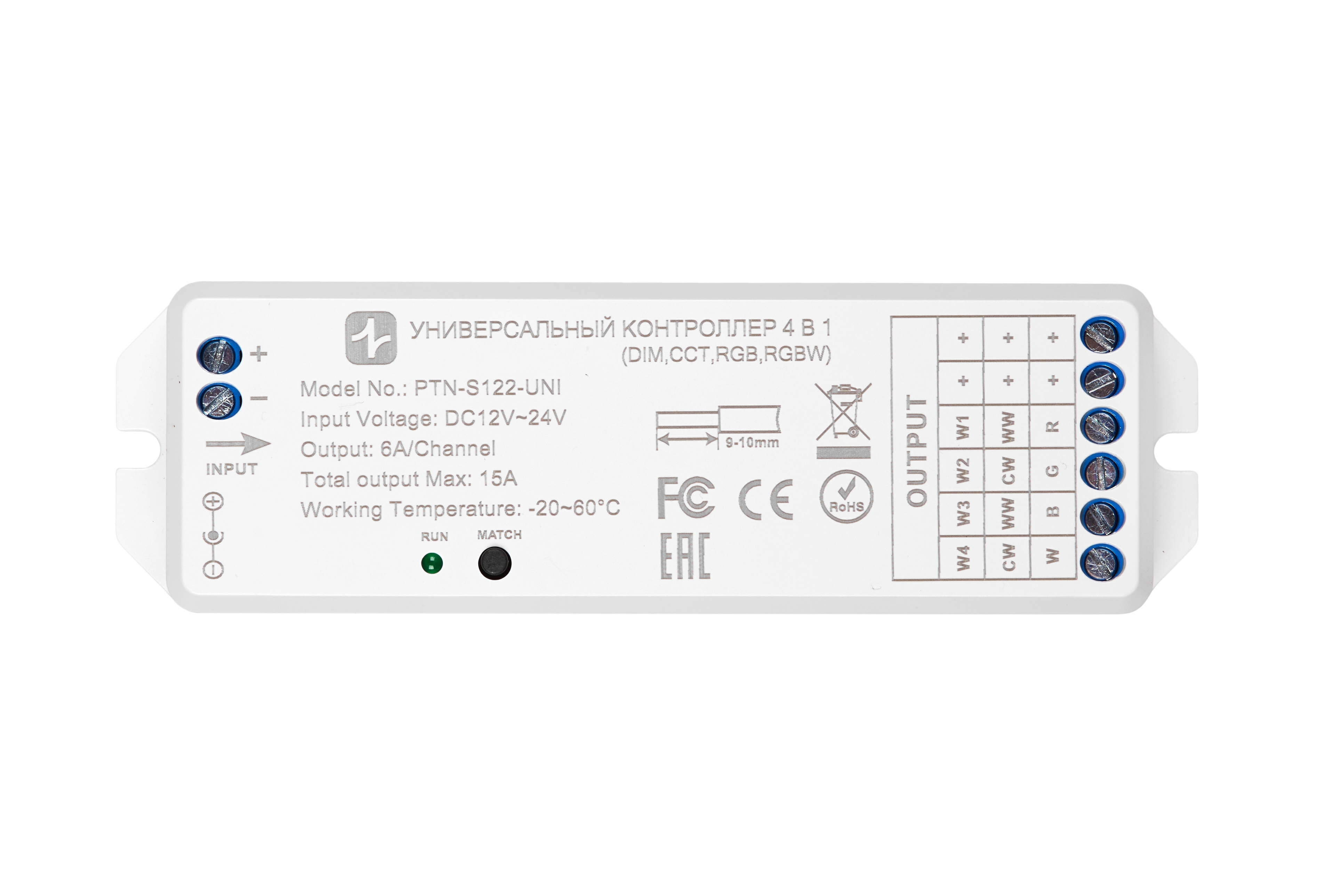 Универсальный контроллер 4в1 PTN-S122-UNI для управления монохромными, RGB, RGBW и CCT LED лентами с напряжением 12 и 24 В. Этот инновационный контроллер станет незаменимым инструментом для создания уникальных осветительных решений, обеспечивая максимальную гибкость и функциональность.