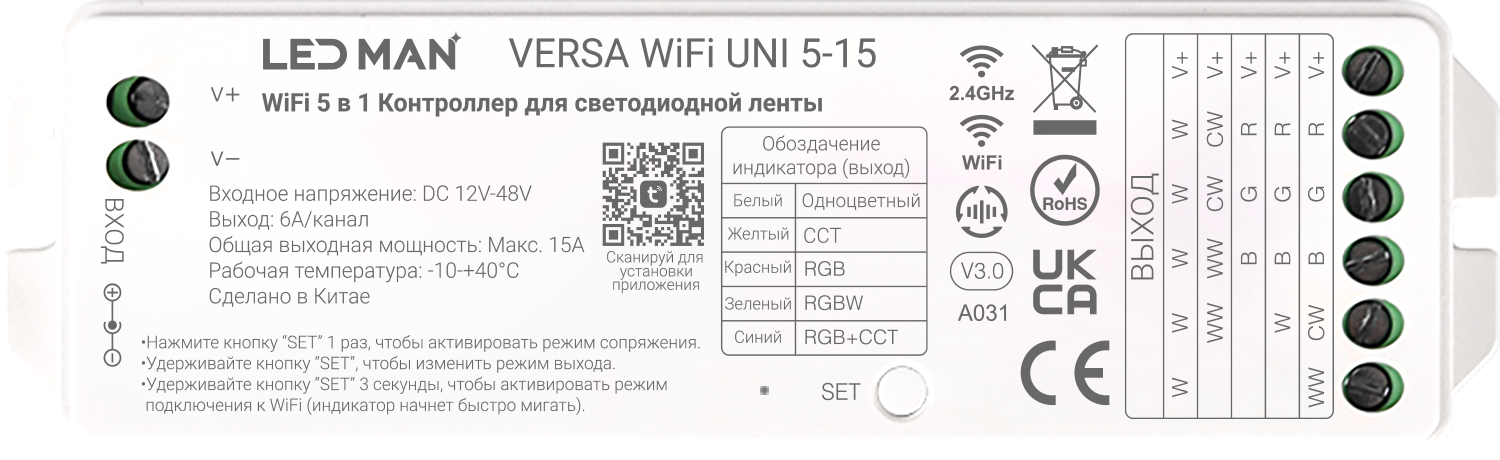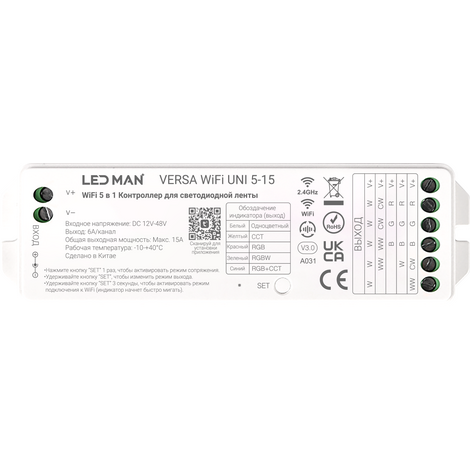 LED MAN, VERSA WiFi UNI 5-15, Контроллер 5 в 1, Одноцветный / CCT / RGB / RGBW / RGB+CCT, 12-48V, 15A, 6A(CH), WiFi+2.4Гц