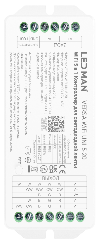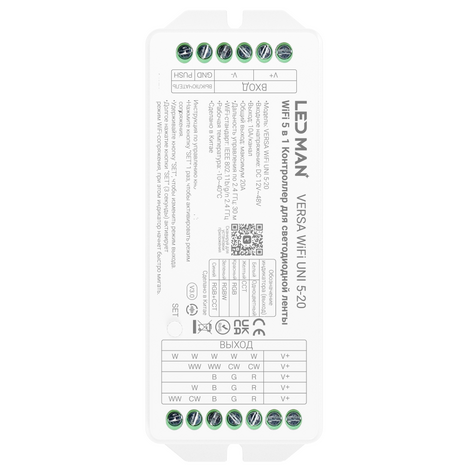 LED MAN, VERSA WiFi UNI 5-20, Контроллер 5 в 1, Одноцветный / CCT / RGB / RGBW / RGB+CCT, 12-48V, 20A, 10A(CH), WiFi+2.4Гц