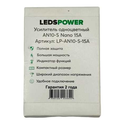 Усилитель одноцветный AN10 Nano 10A LEDS POWER - это компактное и мощное устройство для усиления сигнала светодиодных лент. Производитель LEDS POWER гарантирует высокое качество и надежность работы усилителя. С его помощью можно увеличить яркость и дальность свечения светодиодов. Усилитель подойдет для использования в домашних условиях или профессиональных инсталляциях, где требуется усиление сигнала для индикации или освещения