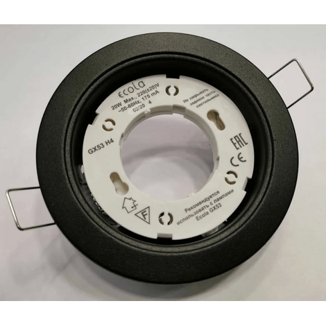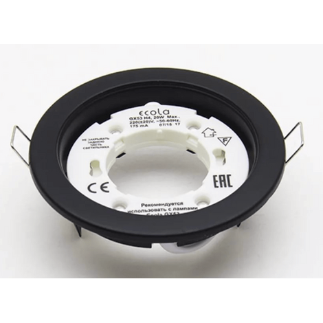 Встраиваемый потолочный светильник Ecola GX53 H4 без рефлектора. Черный матовый. Размер 38x106. Размер монтажного отверстия 90 мм. Пружинное крепление. Патрон GX53. Минимальная необходимая для монтажа высота межпотолочного пространства 38 мм. Защита от прожигов в натяжных и пластиковых потолках.