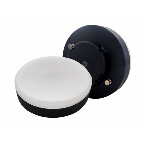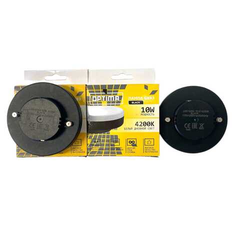 Светодиодная лампочка в форме таблетки с черным цоколем GX53 обладает мощностью в 10 Вт. Цветовая температура — 4200К, т.е. нейтральный белый свет. Изделие рассчитано на использование в сети с переменным напряжением в 175-265В.