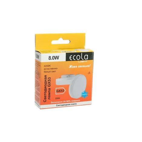 Светодиодная лампа GX53 8 Вт от Ecola имеет тёплый белый свет (2800 К). Она предназначена для декоративной обстановке.