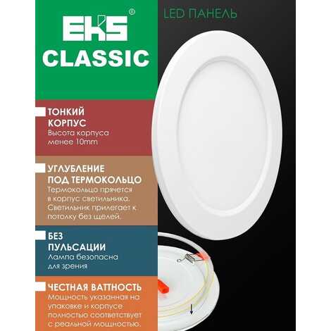 Встраиваемый светодиодный светильник EKS CLASSIC для основного, декоративного и акцентного интерьерного освещения. Универсальная LED панель подходит для натяжного потолка и любых подвесных конструкций. Светодиодная панель имеет равномерный яркий свет без пульсаций и мерцания. Не утомляет и не раздражает глаза. 9 Вт, 720ЛМ, 4200К.