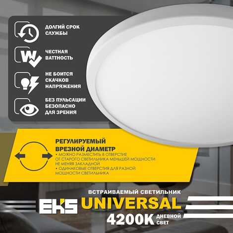 Встраиваемый светодиодный светильник EKS UNIVERSAL для основного, декоративного и акцентного интерьерного освещения. Универсальная LED панель подходит для натяжного потолка и любых подвесных конструкций. Светодиодная панель имеет равномерный яркий свет без пульсаций и мерцания. Не утомляет и не раздражает глаза. 8 Вт, 640ЛМ, 4200К.