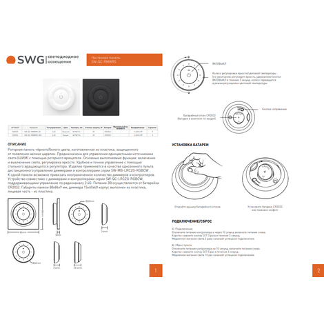 Устройство совместимо с диммерами и контроллерами серии SW-QC-LRCZG-RGBCW, поддерживающими управление по радиоканалу 2.4G. Питание 3В осуществляется от батарейки CR2032. Габариты панели 88х86х9 мм, диммера 15х60х60 корпус выполнен из пластика, лицевая часть - из пластика.