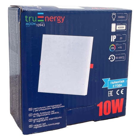 Светодиодный светильник truEnergy с регулируемым креплением квадрат 10W 4000K 1000Lm 98*98мм белый алюминий 10943 имеет матовый безрамочный рассеиватель, который позволяет мягко и равномерно рассеять свет в любом помещении на все 180°. Светильник имеет яркий световой поток 1000Lm. Установка удобная, ведь у него есть регулируемое монтажное крепление, которое можно подогнать под отверстие от 53 до 68мм. Круглое или квадратное, также не имеет значения. Встроенный драйвер высокого качества не только обеспечивает равномерный световой поток без пульсаций, но и работает совершенно бесшумно. Как и другие светодиодные приборы, этот светильник очень экономичный, и в тоже время крайне эффективный вариант освещения любых площадей.