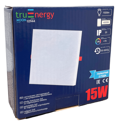 Светодиодный светильник truEnergy с регулируемым креплением квадрат 15W 4000K 1500Lm 116*116мм белый алюминий 10944 имеет матовый безрамочный рассеиватель, который позволяет мягко и равномерно рассеять свет в любом помещении на все 180°. Светильник имеет яркий световой поток 1500Lm. Установка удобная, ведь у него есть регулируемое монтажное крепление, которое можно подогнать под отверстие от 53 до 86мм. Круглое или квадратное, также не имеет значения. Встроенный драйвер высокого качества не только обеспечивает равномерный световой поток без пульсаций, но и работает совершенно бесшумно. Как и другие светодиодные приборы, этот светильник очень экономичный, и в тоже время крайне эффективный вариант освещения любых площадей.