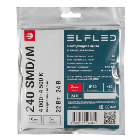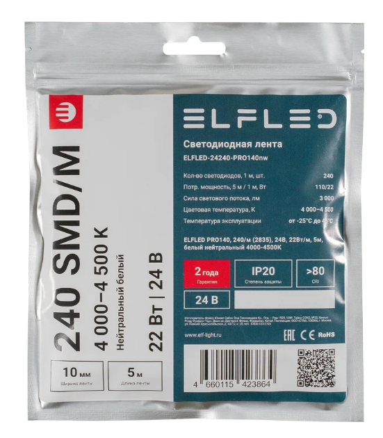 Лента светодиодная ELFLED PRO140, 22Вт/м, 24В, нейтр., 4000-4500К, 240д/м, 5м