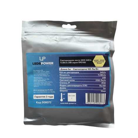 Светодиодная лента LEDS POWER (серия ПРО185), 5м, 24В, IP20, 240 LED/m, нейтральный белый.