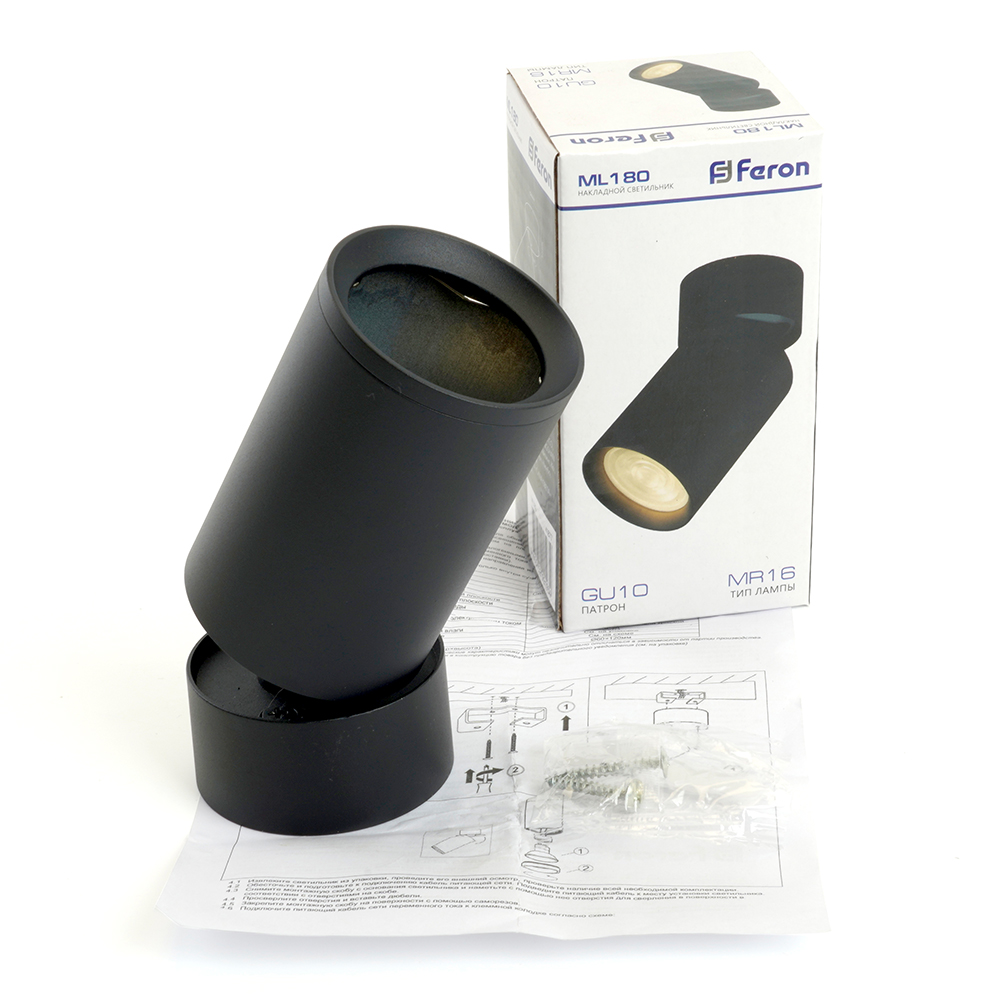 Цилиндрический накладной светильник ML180 Feron имеет надежный алюминиевый корпус, патрон GU10 для ламп MR16 и возможность направлять свет при изменении угла наклона светильника.