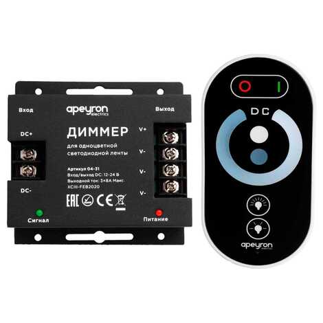 Диммер Apeyron 04-31 предназначен для управления монохромной светодиодной лентой. С помощью него можно включать или выключать светодиодную ленту, отрегулировать ее яркость, а также использовать различные динамические режимы и отрегулировать скорость их работы. Одно из преимуществ изделия заключается в возможности работать как от напряжения 12 В, так и 24 В, а значит его можно использовать со светодиодными лентами с соответствующим напряжением. Важно отметить, что в зависимости от того, с каким напряжением предстоит работать устройству, будет отличаться и максимальная мощность нагрузки, которую можно подключить к нему.