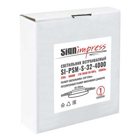 Светильник светодиодный регулируемый (до 205мм) 32Вт 4000K 2800Лм SI-PSM-S-32-4000 SignImpress. Механизм регулировки монтажного диаметра позволяет решить проблему несовпадения диаметра установочного отверстия при замене одних светильников на другие. Данный механизм избавит от дополнительных затрат на дополнительные монтажные работы, сэкономит время на подборе аналогов в заданных размерах. Светильник встраиваемый не содержат ртутьсодержащих веществ, поэтому он не представляет опасности в случае выхода из строя или разрушения. Гарантийный срок службы 1 год. Комплектация: светильник; драйвер.