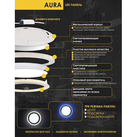 Имеет три режима работы: Центр/Центр + Подсветка/Подсветка. При включении подсветки, светится вся площадь (лицевая сторона + боковые стороны), благодаря чему создается ореол.