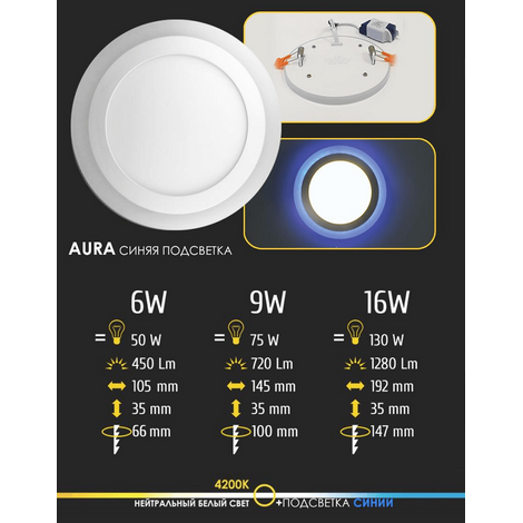 (ВТ) AURA, 6W, 4200K+синий, 450ЛМ, D105*66*35