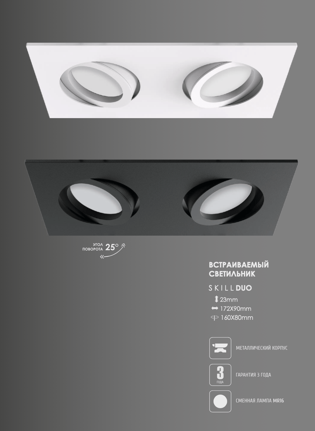 Встраиваемый светильник MR16, SKILL DUO идеально впишется в любой современный интерьер. Благодаря своему металлическому корпусу и качественному покрытию — светильник выглядит эстетично и порадует глаз любому дизайнеру интерьеров.