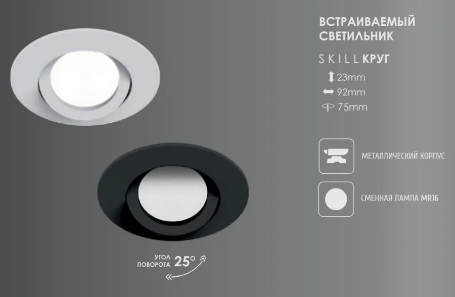 Встраиваемый светильник MR16, SKILL идеально впишется в любой современный интерьер. Благодаря своему металлическому корпусу и качественному покрытию — светильник выглядит эстетично и порадует глаз любому дизайнеру интерьеров.