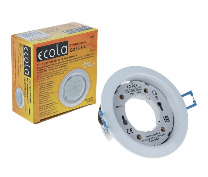 Светильники GX53 являются самым удачным вариантом для натяжных и подвесных потолков. Это идеальная альтернатива светильникам-спотам на горячих галогенках. Простая замена ламп, светильник не нужно вынимать из потолка. До 10 раз меньше энергопотребление и тепловыделение (светильник почти не нагревается). Отсутствует риск прожогов в натяжных потолках. Можно устанавливать в пластиковую или деревянную поверхность без дополнительной термоизоляции.