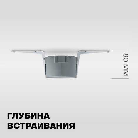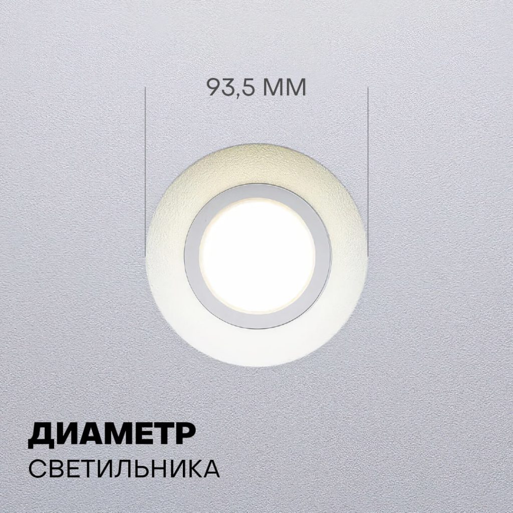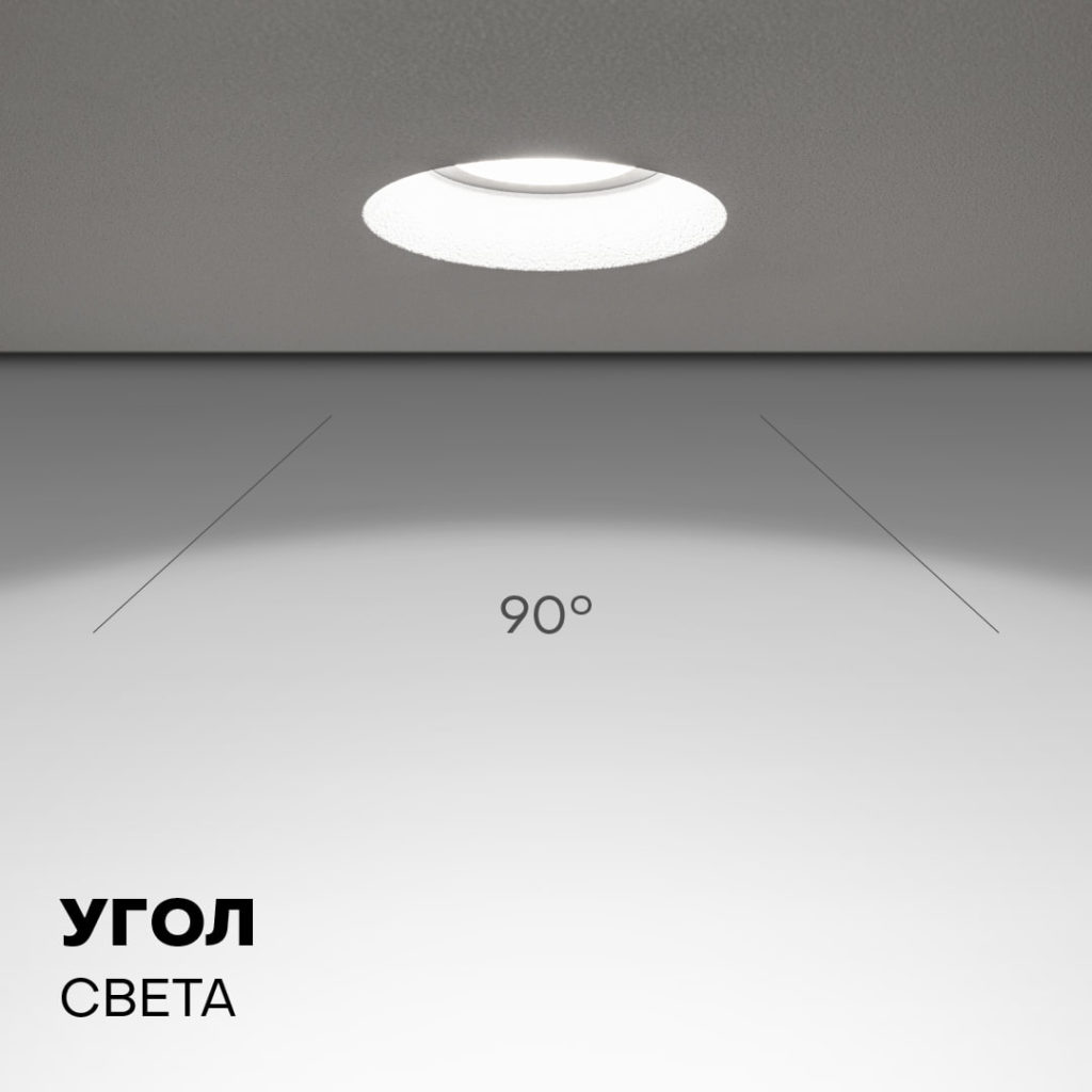 Угол светового пучка светильника — 90С. Монтаж занимает пару минут и не требует дополнительных закладных. Рекомендуем использовать для устройства лампы с цоколем GU10 мощностью до 9 Вт.