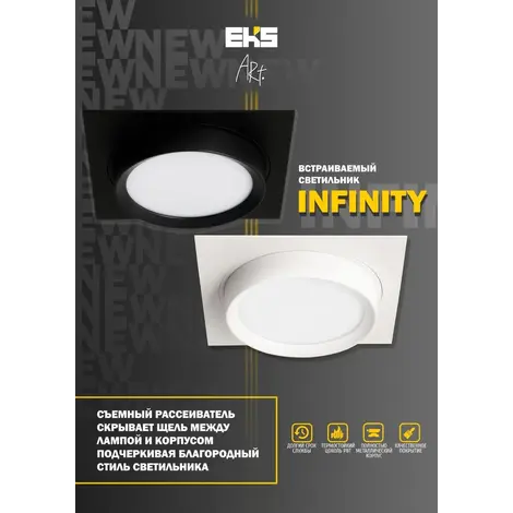 Встраиваемый светильник GX53, ART INFINITY отлично подойдет для установки на низкий потолок в гостиной, оформленной в стиле хай-тек. Производитель EKS рекомендует использовать для устройства светодиодные лампы с цоколем GX53 (в комплект поставки не входят). Светильник произведен с использованием материалов: металл и акрил и может использоваться для натяжного потолка.