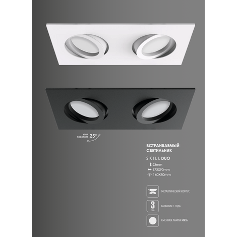 Встраиваемый светильник MR16, SKILL DUO идеально впишется в любой современный интерьер. Благодаря своему металлическому корпусу и качественному покрытию — светильник выглядит эстетично и порадует глаз любому дизайнеру интерьеров.