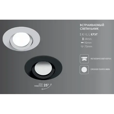 Встраиваемый светильник MR16, SKILL идеально впишется в любой современный интерьер. Благодаря своему металлическому корпусу и качественному покрытию — светильник выглядит эстетично и порадует глаз любому дизайнеру интерьеров.