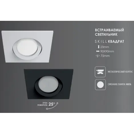 Встраиваемый светильник MR16, SKILL идеально впишется в любой современный интерьер. Благодаря своему металлическому корпусу и качественному покрытию — светильник выглядит эстетично и порадует глаз любому дизайнеру интерьеров.