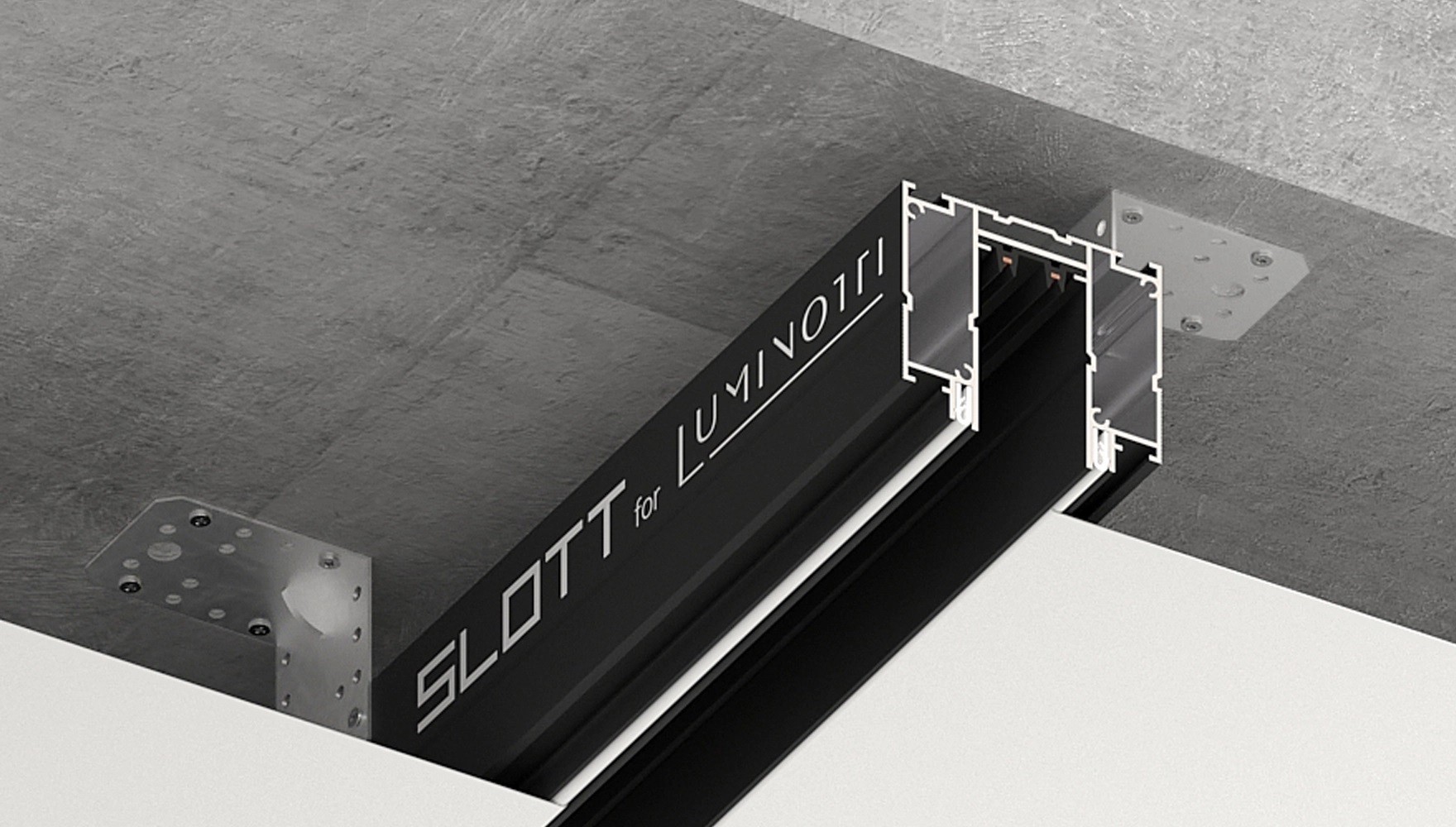 Трек-система SLOTT FOR LUMINOTTI — кобрендинговый продукт KRAAB SYSTEMS и LUMINOTTI. SLOTT FOR LUMINOTTI представляет собой единую цельную литую конструкцию, объединяющую профиль с демпферной системой крепления потолка и шинопровод.